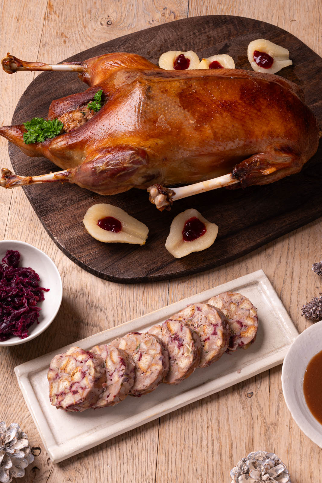 Gans aus dem Ofen - mit Walnuss-Cranberry-Semmelfüllung. Bonus: Abwandlung der Füllung als Serviettenknödel!